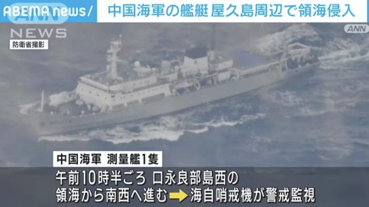 共同社報道稱,據日防衞省透露,中國測量船於凌晨3點20分左右,在種子島東南約50公里海域向西航行。從種子島以南駛入“領海”外側的毗連區後,於早晨6點50分左右在屋久島以南駛入所謂“領海”,之後,該船在所謂“領海”內移動,上午10點半左右從口永良部島以西駛出。