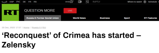 RT稱,根據澤連斯基的説法,基輔僅僅反覆聲明“克里米亞半島是烏克蘭領土的一部分”是不夠的。他還稱,俄羅斯幾乎不會放棄克里米亞,烏克蘭應該準備好通過武力將其“重新奪回”。