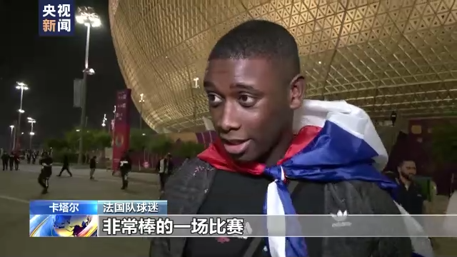 *法國隊球迷:*非常棒的一場比賽,姆巴佩超級棒,三粒進球,但不夠走運。梅西拿到了他夢寐以求的世界盃(冠軍),我不想説為梅西感到高興,但對他來説的確是很好的一屆盃賽。祝法國隊好運,不要放棄,下次冠軍屬於我們。