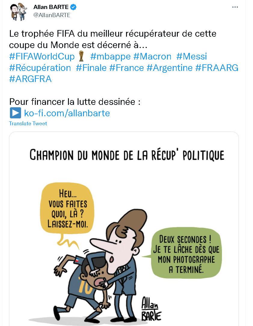 有法國的諷刺漫畫家甚至作畫一張,調侃了馬克龍對姆巴佩摟抱的這一幕: