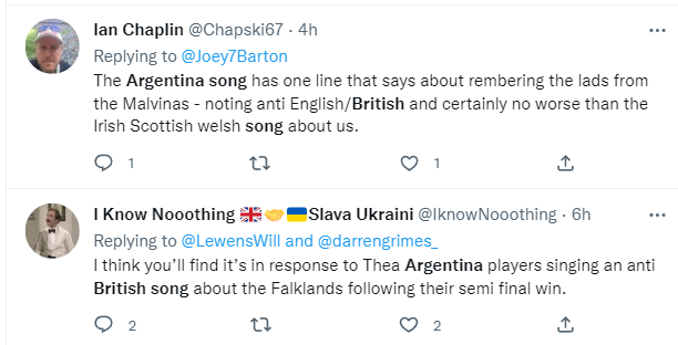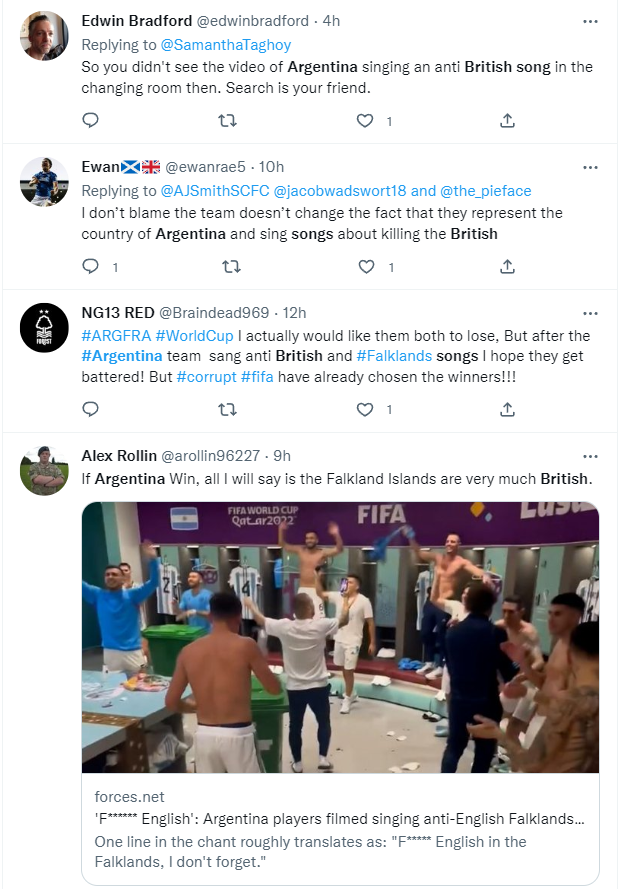 在阿根廷奪得本屆世界盃冠軍後,許多對阿根廷極度不滿的英國網民開始舊事重提,稱自己絕對不會忘記阿根廷隊唱“殺英國人”歌曲這事。