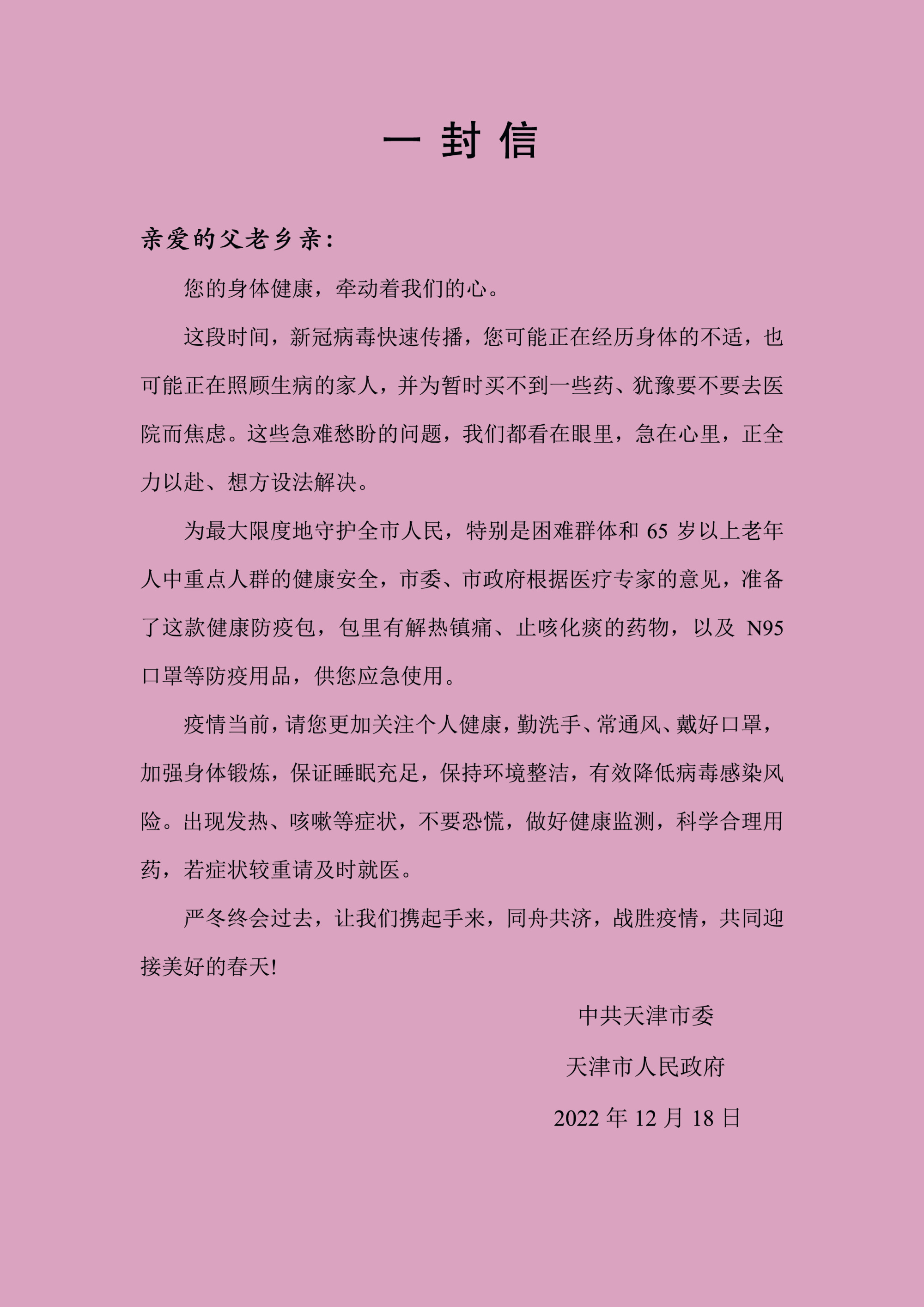 隨着防疫包一起發出的,還有天津市委市政府寫給羣眾的一封信,對當下防疫進行提示:疫情當前,請您更加關注個人健康,勤洗手,常通風,戴好口罩,加強身體鍛鍊,保證睡眠充足,保持環境整潔,有效降低病毒感染風險。出現發熱、咳嗽等症狀,不要恐慌,做好健康監測,科學合理用藥,若症狀較重請及時就醫。