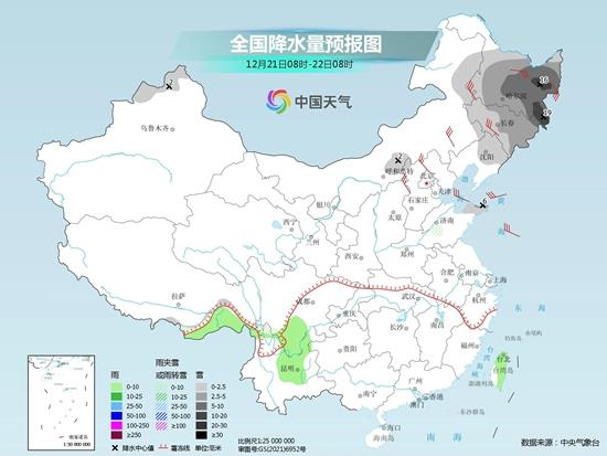 明天,內蒙古中東部、東北地區中南部有小到中雪,其中遼寧東部、吉林中部和東南部局地有大雪。安徽北部和南部、山東半島東部等地部分地區有雨夾雪。雲南中部和東北部、四川南部、重慶、湖南北部、湖北中西部、河南南部、浙江東北部、海南島中東部等地部分地區有小雨。