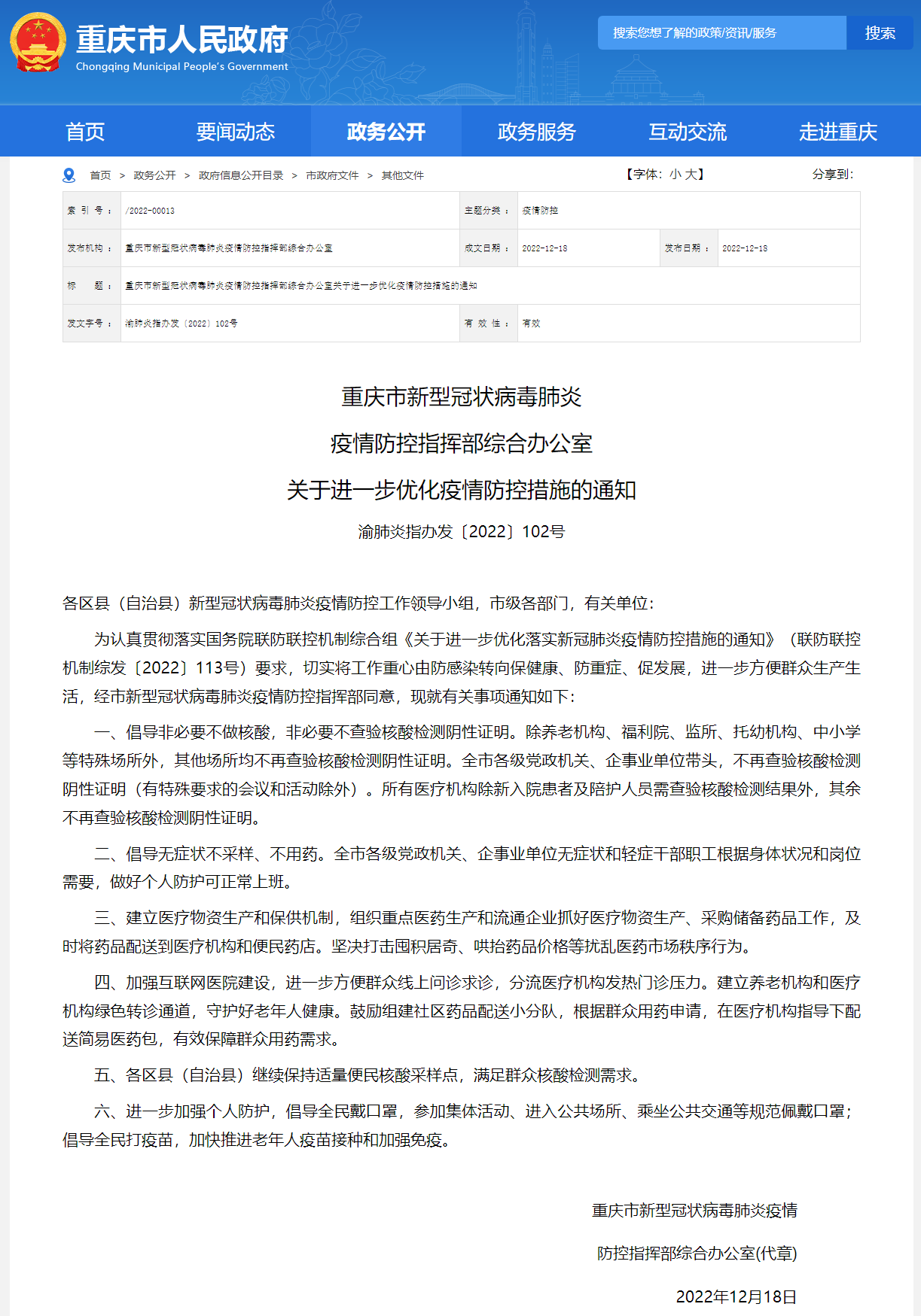 12月18日,記者從重慶市衞生健康委員會獲悉,重慶市新型冠狀病毒肺炎疫情防控指揮部綜合辦公室發佈關於進一步優化疫情防控措施的通知。通知原文如下: