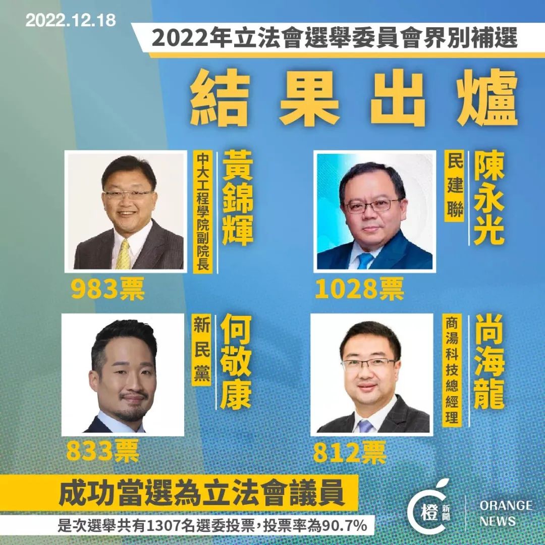 【環球時報綜合報道】2022年香港立法會選委會界別補選18日舉行,由6名候選人競逐4個議席。最終,民建聯中醫師陳永光、中文大學工程學院副院長黃錦輝、新民黨的何敬康以及商湯科技香港公司總經理尚海龍4人當選。