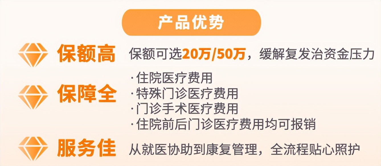 水滴髓無憂,是一款對急性白血病患者提供復發保障的醫療險。據介紹,水滴髓無憂為被保險人提供最高50萬元的醫療保險金,能較大程度緩解白血病患者復發後的醫療資金壓力。該產品保障範圍全面覆蓋被保險人白血病首次復發後的“住院醫療費用;特殊門診醫療費用;門診手術醫療費用;住院前後門急診醫療費用”,免賠額2萬元,凡是保障範圍內的醫療費用經社保結算後報銷80%。