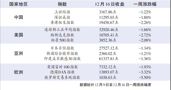 上週海外主要市場均延續了下跌走勢,市場受到全球經濟下行擔憂的影響,併疊加上週歐美央行偏鷹派態度的衝擊。其中,美國三大股指均出現下跌,標準普爾指數、納斯達克指數和道瓊斯工業指數分別下跌了2.08%、2.72%、1.66%。