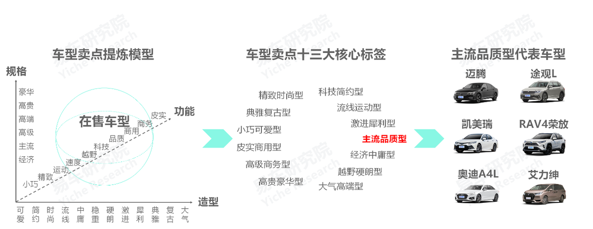 本報告聚焦主流品質型車市,由設計相對中庸,定位主流市場與凸顯品質調性的車型組成,聚焦15-35萬元價區,以中型轎車、中型SUV等級別為主,代表車型有邁騰、凱美瑞、途觀L、艾力紳等。