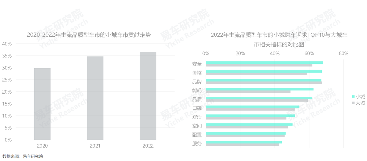由於學歷、收入等更低,職業更聚焦工人等傳統領域,小城用户正不斷強化主流品質型車市的理性與務實訴求。2022年,安全、價格、能耗等都位列小城用户對主流品質型產品訴求的TOP5,且佔比明顯高於大城用户;