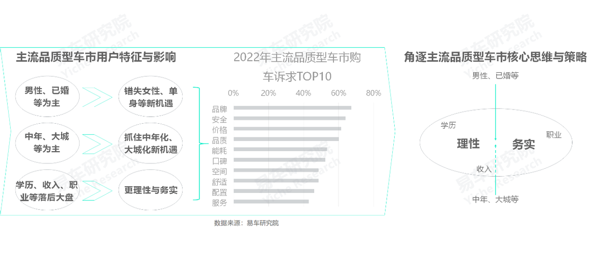 對比大盤,主流品質型車市的用户學歷、收入等更低,工人、農民、企業基層管理層等佔比更突出,共同強化了該車市的理性與務實的消費訴求。換購主導,2022年位居主流品質型車市購車訴求榜首的是品牌,但緊隨其後的安全、價格、品質、能耗等,都與理性和務實特徵高度吻合;