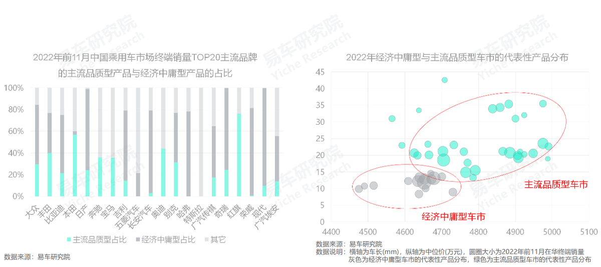 2022年前11月,在中國乘用車終端銷量TOP20的主流品牌中,有過半品牌的20%及以上銷量來自主流品質型車市,且銷量排行越靠前越顯著。另外,TOP20中有75%的品牌的過半銷量來自經濟中庸型和主流品質型兩大細分車市,但由於價區更高、利潤更多,對比經濟中庸型產品,主流品質型產品對車企的價值更大,該車市類似於車企的戰略高地;