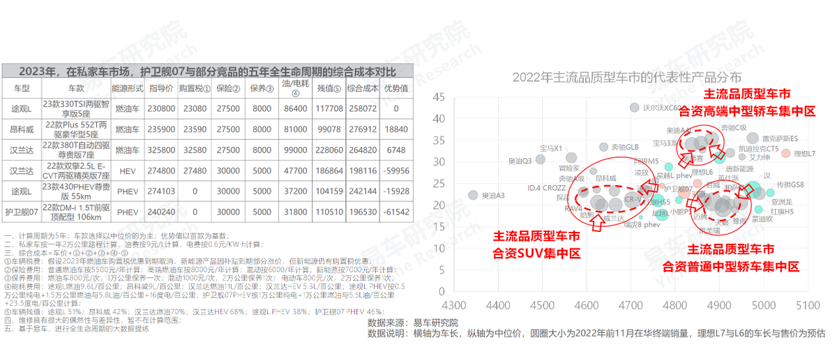 中國品牌節能型產品的核心競爭力,就是簡單粗暴抓住了用户最敏感的購車神經,即全生命週期的綜合成本。基於2022年底售價,假設燃油車購置税優惠如期取消,新能源因補貼退出而部分加價等,護衞艦07在私家車市場的五年綜合成本降至20萬以內,比途觀L、昂科威等同級別燃油車足足多出六七萬元優勢值。在技能技術不提升的前提下,為抗衡護衞艦07等節能型產品,途觀L、昂科威等合資車除大規模降價促銷,沒更好選擇;
