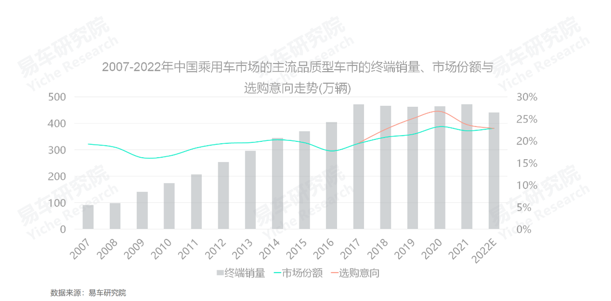 2017-2022年,主流品質型車市的終端銷量裹足不前,2022年將失守450萬輛,且選購意向快速下滑,日後走勢不容樂觀。
