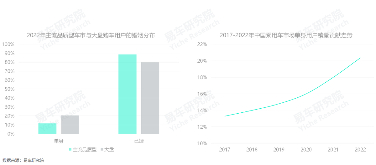 基於2022年前11月調研數據,預判2022年中國乘用車市場的單身佔比20.36%,但主流品質型車市的已婚佔比近90%,單身佔比小得多。單身用户的購車特徵要麼偏經濟,要麼偏個性,但中高端規格和中規中矩設計的主流品質型車市,既不太經濟也不太個性化,對單身用户非常不友好;