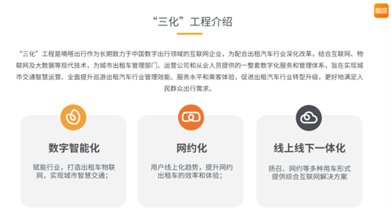 針對巡遊出租車行業,嘀嗒出行深入貫徹落實全面深化出租車行業改革的決策部署,從2019年至今,深入實推進以數字智能化、網約化、線上線下一體化為核心的出租車“三化”工程,“數字化揚招”和網約化”雙向發力,數字化出租車整個服務鏈條,從數字交通管理、出租車服務、行業效率三個維度,對傳統出租車行業進行賦能。