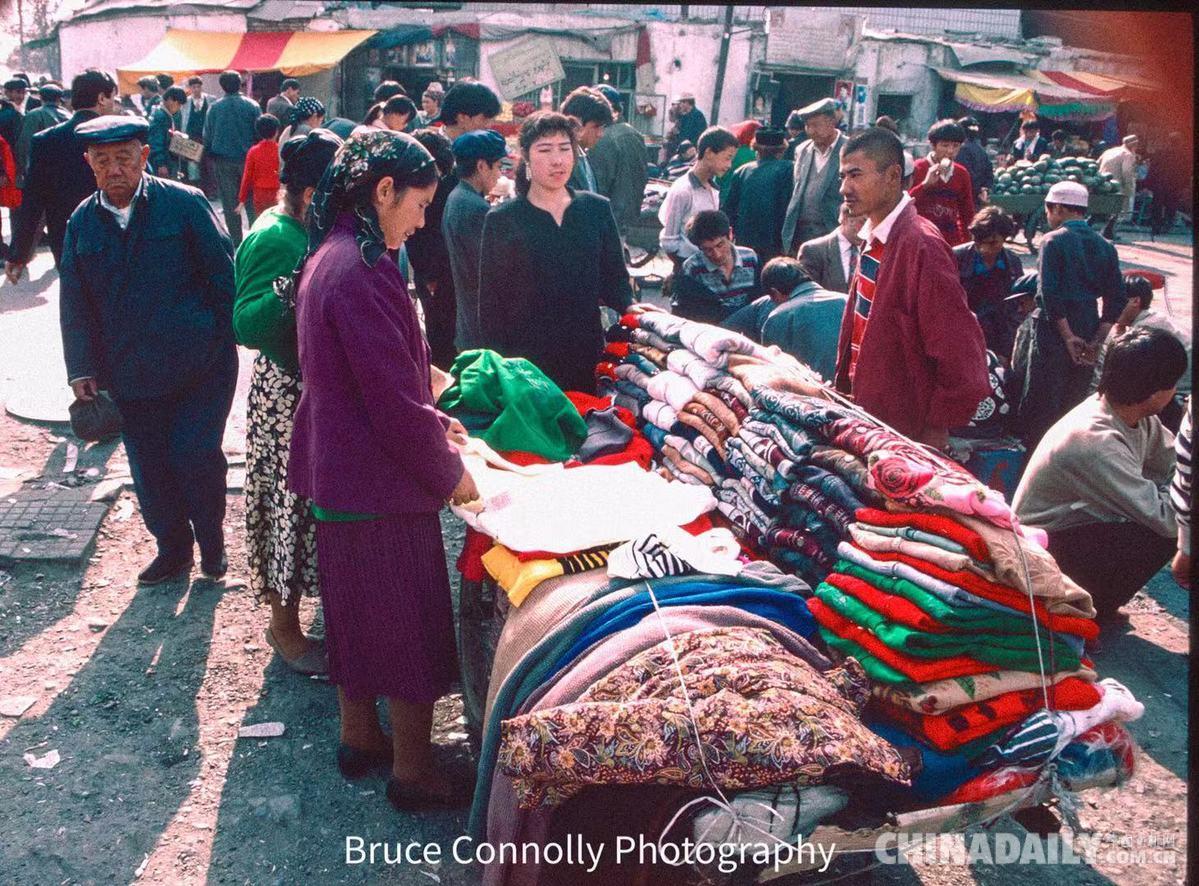 布魯斯在詢問當地人後,先去了大巴扎,看到了從未見過的新疆美食、服飾和各種工藝品,這讓他的快門就再也沒有停下過。老布回憶稱,自己當時找了張桌子、要了一杯啤酒,看着眼前的一切,彷彿在做夢。大家穿着新疆的民族服飾載歌載舞,很多人也因為好奇來找他攀談。老布説:“有人問我你當時害怕嗎?當然沒有!新疆人民太熱情了,我一點都沒有感到緊張。”