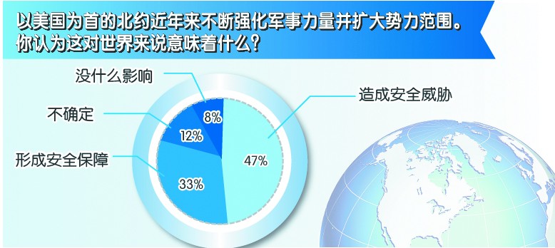 北約不顧俄羅斯的擔憂持續東擴被認為是俄烏衝突爆發的重要原因。當被問及如何看待以美國為首的北約近年來不斷強化軍事力量並擴大勢力範圍時,47%的受訪者認為北約的這一行為“造成安全威脅”,33%的人認為這“形成安全保障”,還有12%的人表示不確定這意味着什麼,只有不到一成的人表示“沒什麼影響”。