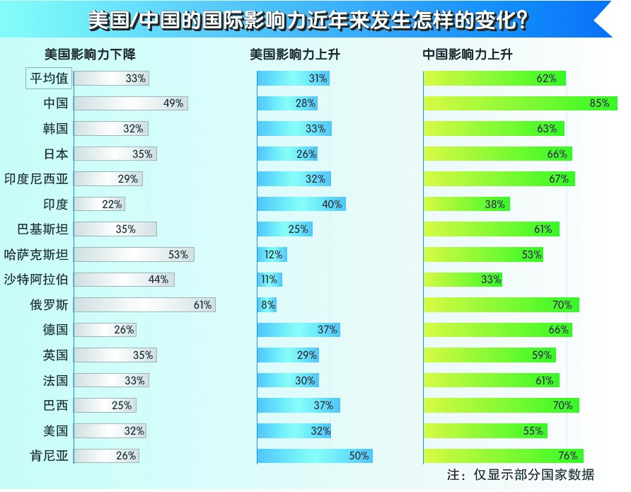 對於“美國/中國的國際影響力近年來發生怎樣的變化?”這一問題,33國的平均數據顯示,認為美國影響力上升和下降的受訪者比例相近,都在三成左右;認為中國影響力上升的受訪者佔比62%,是美國的兩倍。中國人民大學國際事務研究所所長王義桅對《環球時報》記者表示,在過去20年的世界性危機中,中美兩國總能依靠自身實力抵禦風暴,世界各國人民都看到了中美兩國擁有“向上走”的力量,因此在不同程度上認為中國和美國的國際影響力在上升。