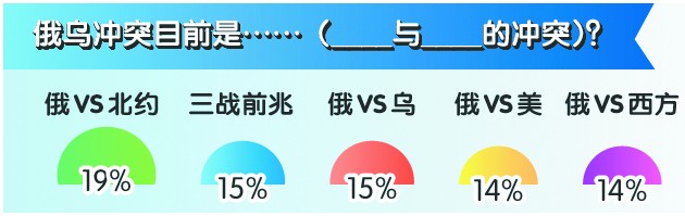 2022年,俄烏衝突的爆發無疑對世界地緣政治產生劇烈衝擊。環球輿情調查中心的民調結果顯示,認為俄烏衝突是俄羅斯與北約之間衝突的受訪者比例最高,為19%;認為衝突僅僅是俄羅斯和烏克蘭之間的衝突,以及認為這一衝突是“第三次世界大戰的前兆”受訪者的比例都達到15%;認為俄烏衝突是俄羅斯與美國之間的衝突,以及認為這一衝突是俄羅斯與西方之間衝突的受訪者比例均達到14%。