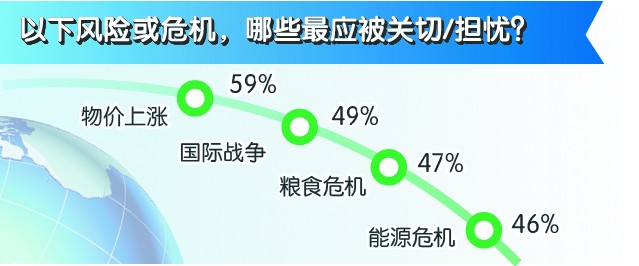 2022年,疫情、能源危機、通貨膨脹等問題成為不少國家面臨的挑戰。在各類問題中,民眾最關心的是什麼?本次調查結果顯示,在33國的受訪者中,選擇“物價上漲”的人比例最高,達到59%。“國際戰爭”“糧食危機”“能源危機”位列最受關注問題的第二梯隊,分別佔49%、47%和46%。此外,失業率、疫情和恐怖主義也成為部分國家民眾最關切的問題。