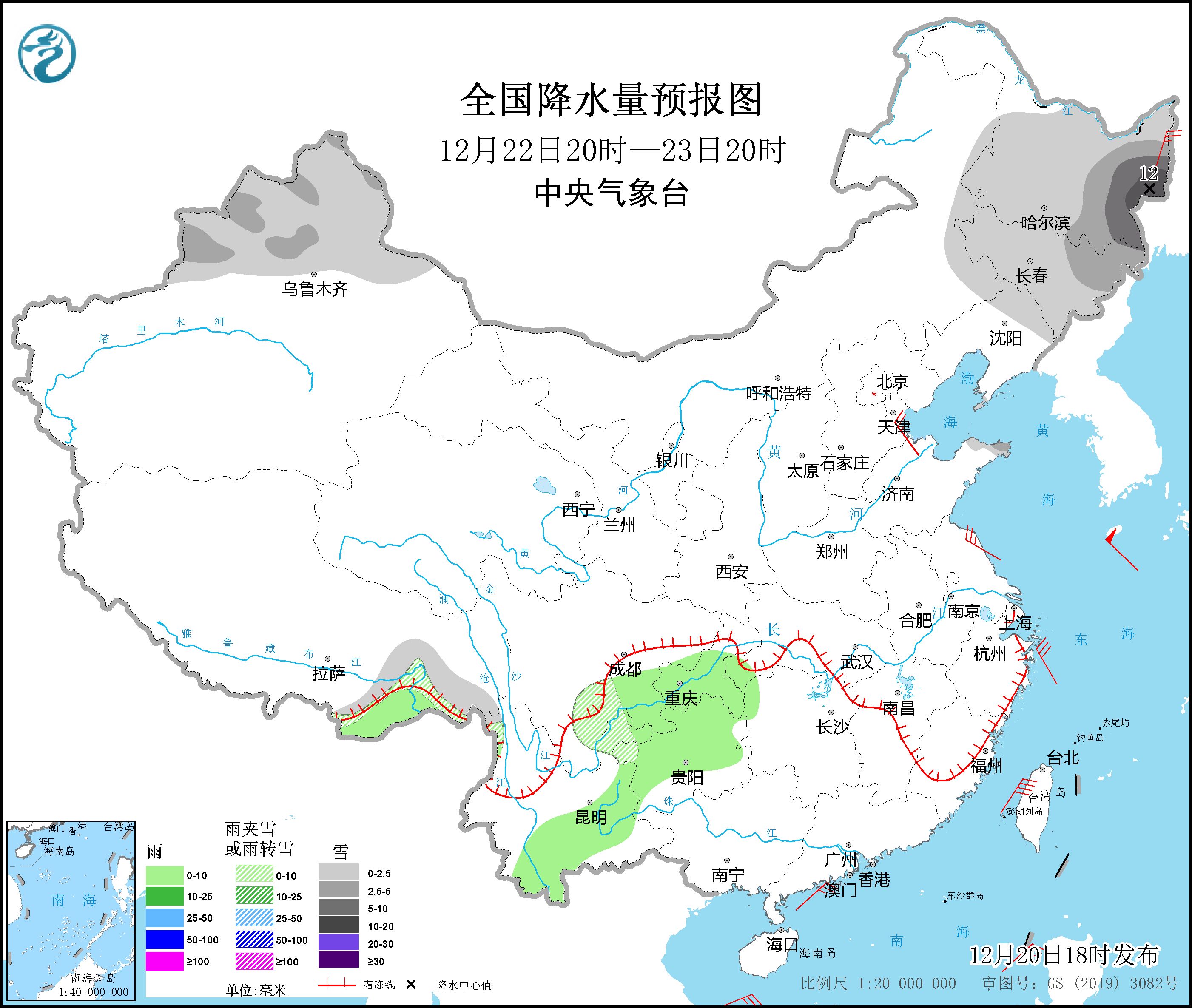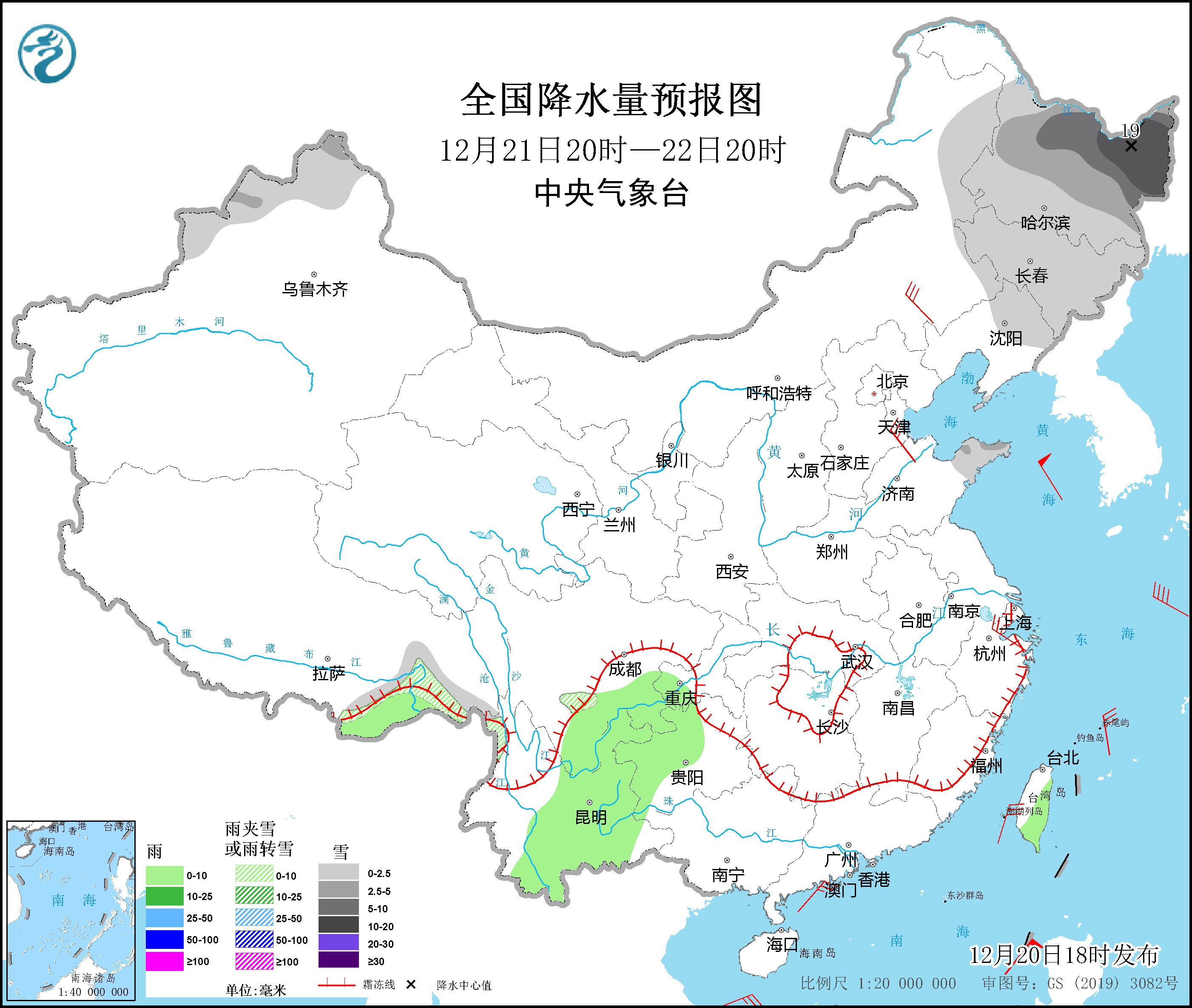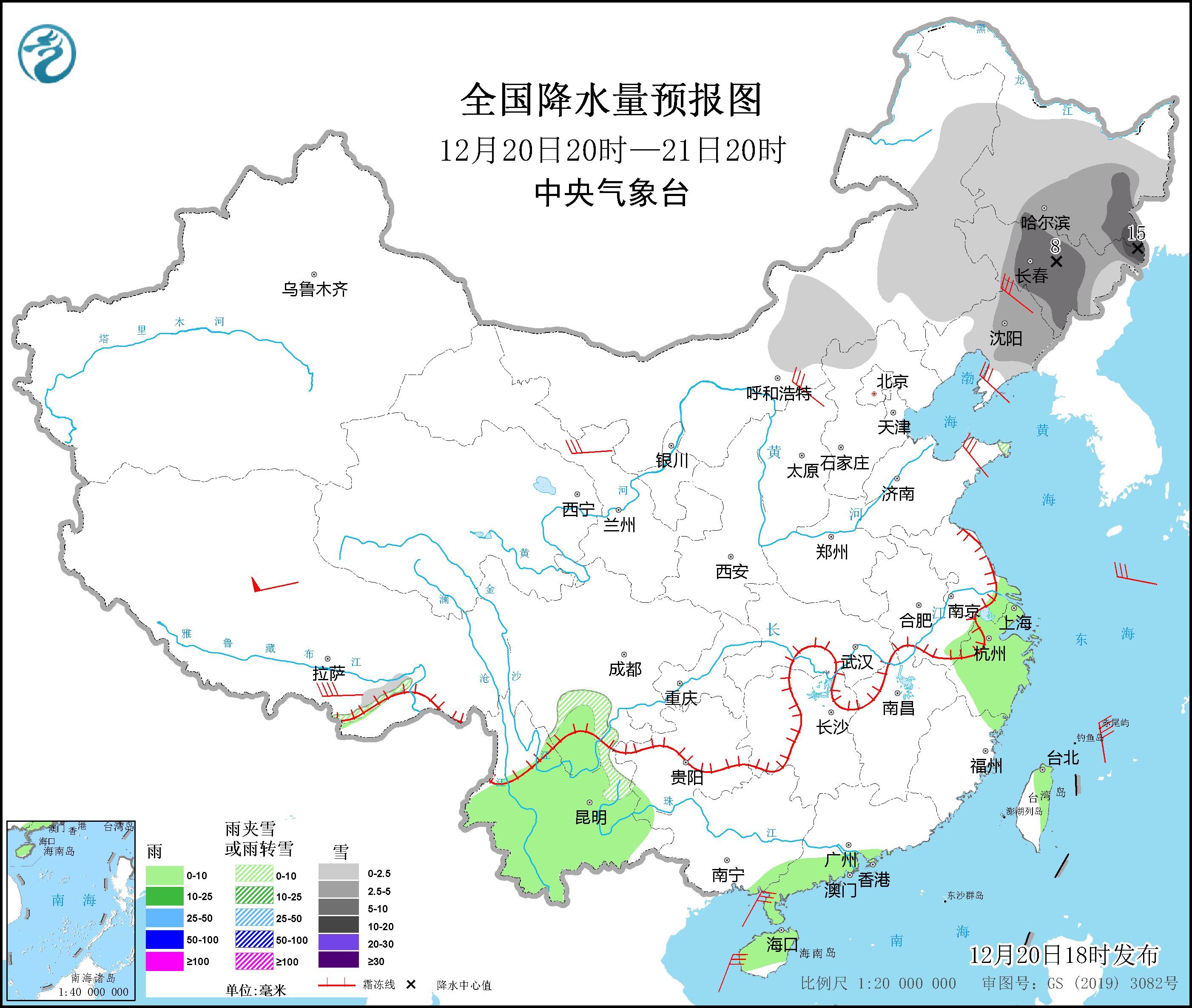 *12月20日20時至21日20時,*內蒙古中東部、遼寧中東部、吉林、黑龍江大部等地部分地區有小到中雪,其中,黑龍江東南部、吉林中東部等地部分地區有大到暴雪(10~15毫米)。上海、浙江、江蘇南部、四川盆地南部、雲南大部、廣西東南部沿海、廣東西南部、海南島大部、台灣島北部和東部等地部分地區有小雨或雨夾雪。遼寧北部、西藏中南部、甘肅中部、山西北部、山東半島等地部分地區有5~7級風;渤海、渤海海峽、黃海大部海域、東海大部海域、台灣海峽偏南海域、台灣以東洋麪、巴士海峽、南海東部和中部海域、南海西南部海域將有7~8級、陣風9~10級的西北到東北風(見圖1)。