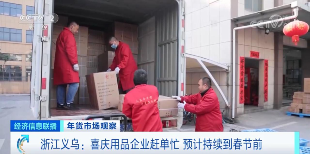 在浙江義烏的一家喜慶用品生產企業,員工們正在忙着搬運剛打包好的產品,倉庫主管蔣學功説,企業迎來了客户的補貨高峯,現在每天的發貨清單一大早就能擺滿一桌子。