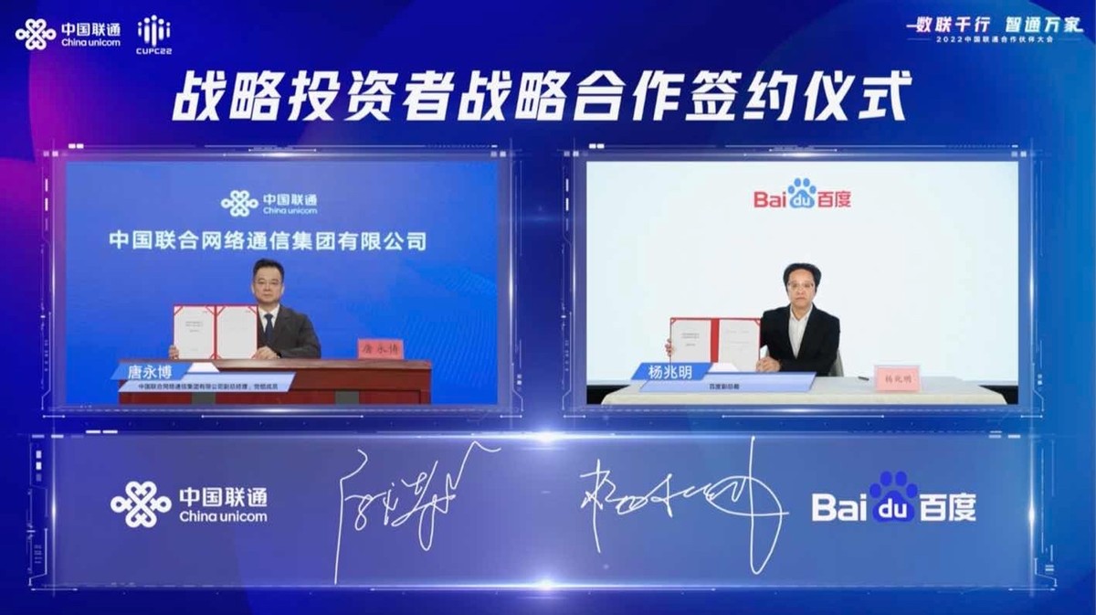12月20日,在2022中國聯通合作伙伴大會上,百度與中國聯通簽署全新的五年期戰略合作協議。這是雙方繼2017年首次戰略合作後再度聯手開啓的新一輪合作。中國聯通集團副總經理唐永博、百度副總裁楊兆明代表雙方簽約。