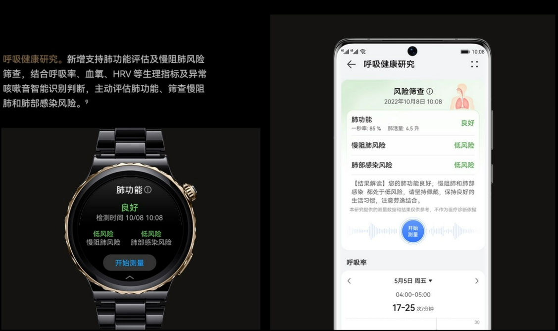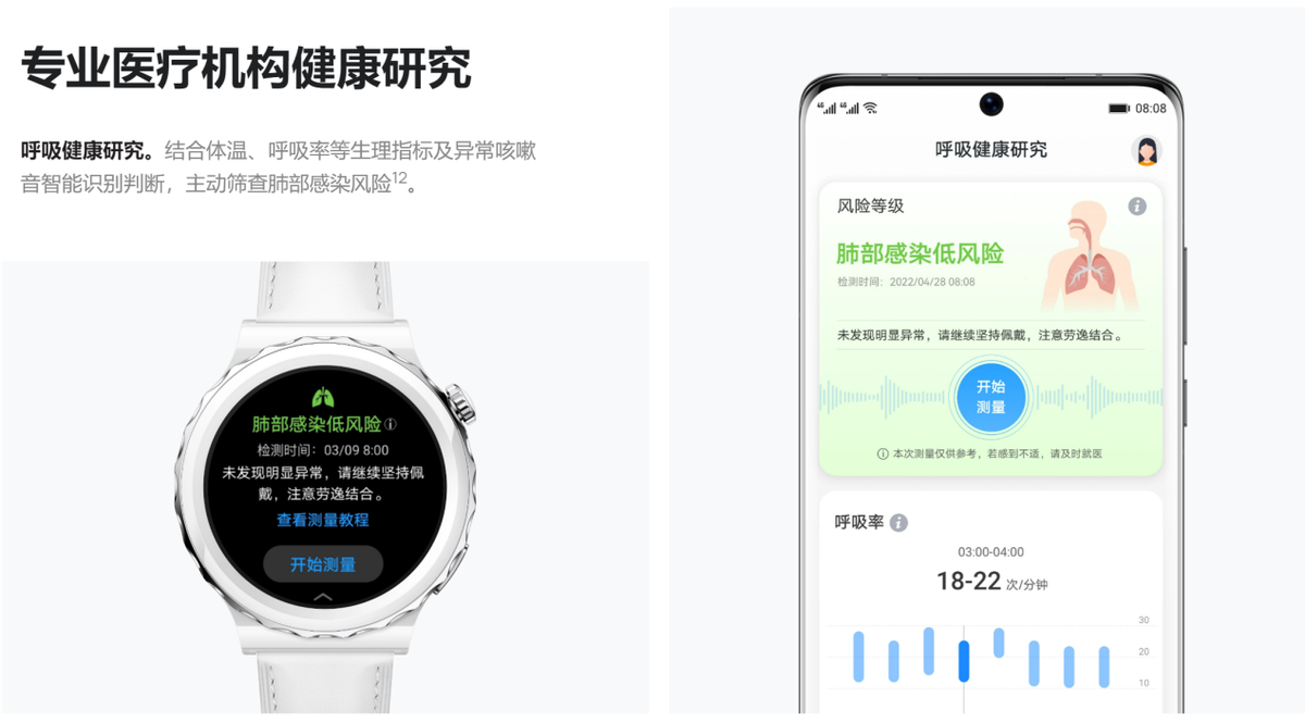 為了帶來更具權威性的健康管理,華為已與超過80家研究機構合作開展健康研究,包括心臟健康研究、睡眠呼吸暫停研究、血管健康研究、呼吸健康研究、女性健康研究等,覆蓋人體8大系統,配合華為穿戴設備,消費者即可通過參與研究,進行主動健康管理,目前已有超過擁有800萬+用户羣體。特別是在今年大環境的變化下,華為還就呼吸健康研究帶來全新升級,支持肺功能評估和慢阻肺研究。加入了由301醫院、北京大學第一醫院聯合發起,基於HRV、呼吸率、血氧等生理參數相比於正常人基線的變化,結合是否異常咳嗽音的識別與判斷,建立肺功能評估和慢阻肺篩查模型,並進行肺功能評估,可識別慢阻肺風險和肺部感染風險,實現居家風險篩查。