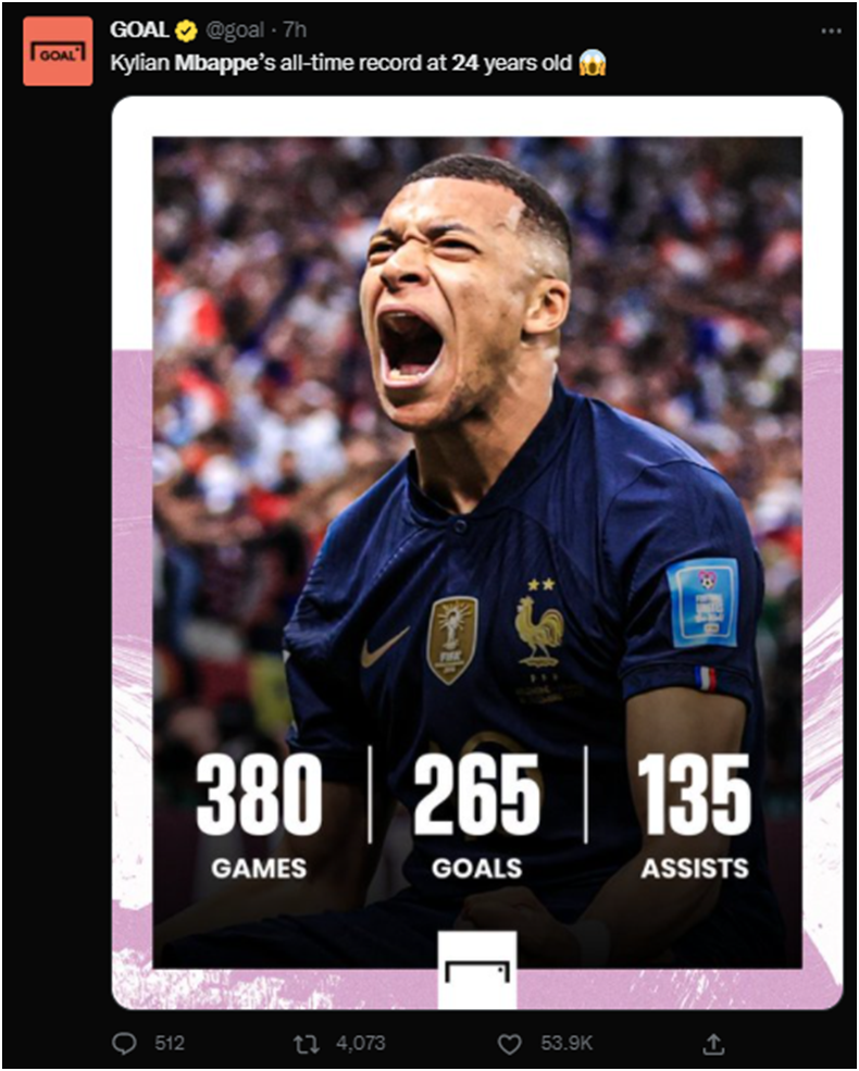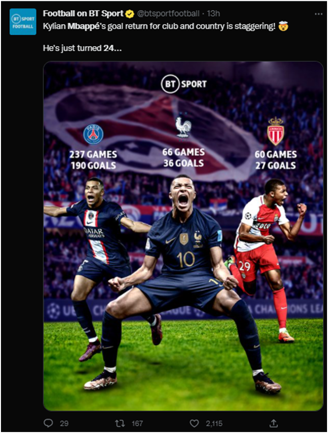 英國體育媒體“BT Sport”足球頻道發推説:“基利安·姆巴佩在俱樂部和國家隊的進球效率是驚人的!他才24歲……”下方配圖顯示,姆巴佩在法國國家隊出場66次、打進36球,為巴黎聖日耳曼俱樂部出場237次、打進190球,他在此前摩納哥俱樂部出場60次、打進27球。↓