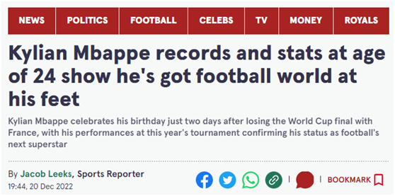 英國《鏡報》更是在20日以“基利安·姆巴佩在24歲時的記錄和數據表明,足球世界就在他的腳下”為題發佈文章,認為法國隊雖然決賽失利,但姆巴佩未來一片光明。