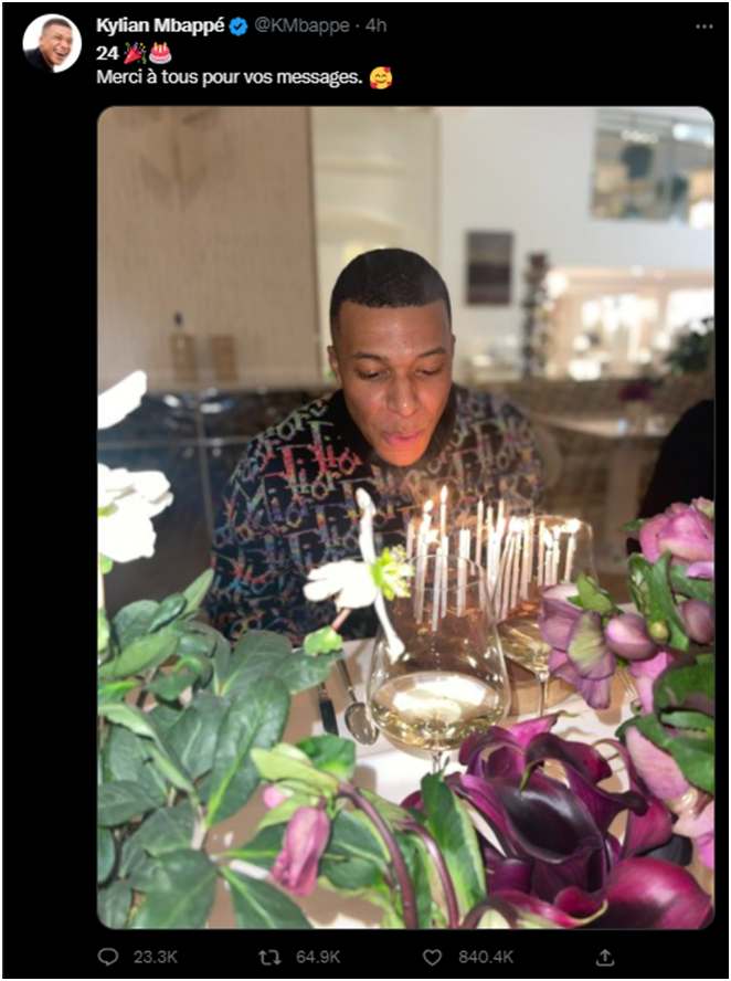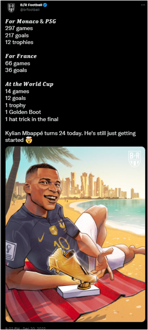 體育媒體“B/R”足球頻道20日也發佈了姆巴佩一系列耀眼數據,俱樂部層面上,他為摩納哥和巴黎聖日耳曼俱樂部出場297次、打進217球、收穫12次冠軍獎盃;法國國家隊層面,他出場66次、打進36球;世界盃層面,他出場14次、打進12球、收穫一次大力神杯和金靴獎,並在決賽上演帽子戲法。“B/R”同時表示“基利安·姆巴佩今天24歲了,(但)他才剛剛開始。”同樣也配了一個表示驚訝的表情包。↓