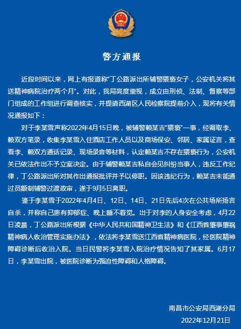 鑑於李某雪於2022年4月4日、12日、14日、21日先後4次在公共場所揚言自殺,並稱自己患有抑鬱症、晚上睡不着覺。出於對李的人身安全考慮,4月22日凌晨,丁公路派出所根據《中華人民共和國精神衞生法》和《江西省肇事肇禍精神病人收治管理實施辦法》,依法將李某雪送江西省精神病醫院,經醫院精神障礙診斷後收治入院。當日民警將李某雪入院治療情況告知了其家屬。6月17日,李某雪出院,被醫院診斷為強迫性障礙和人格障礙。