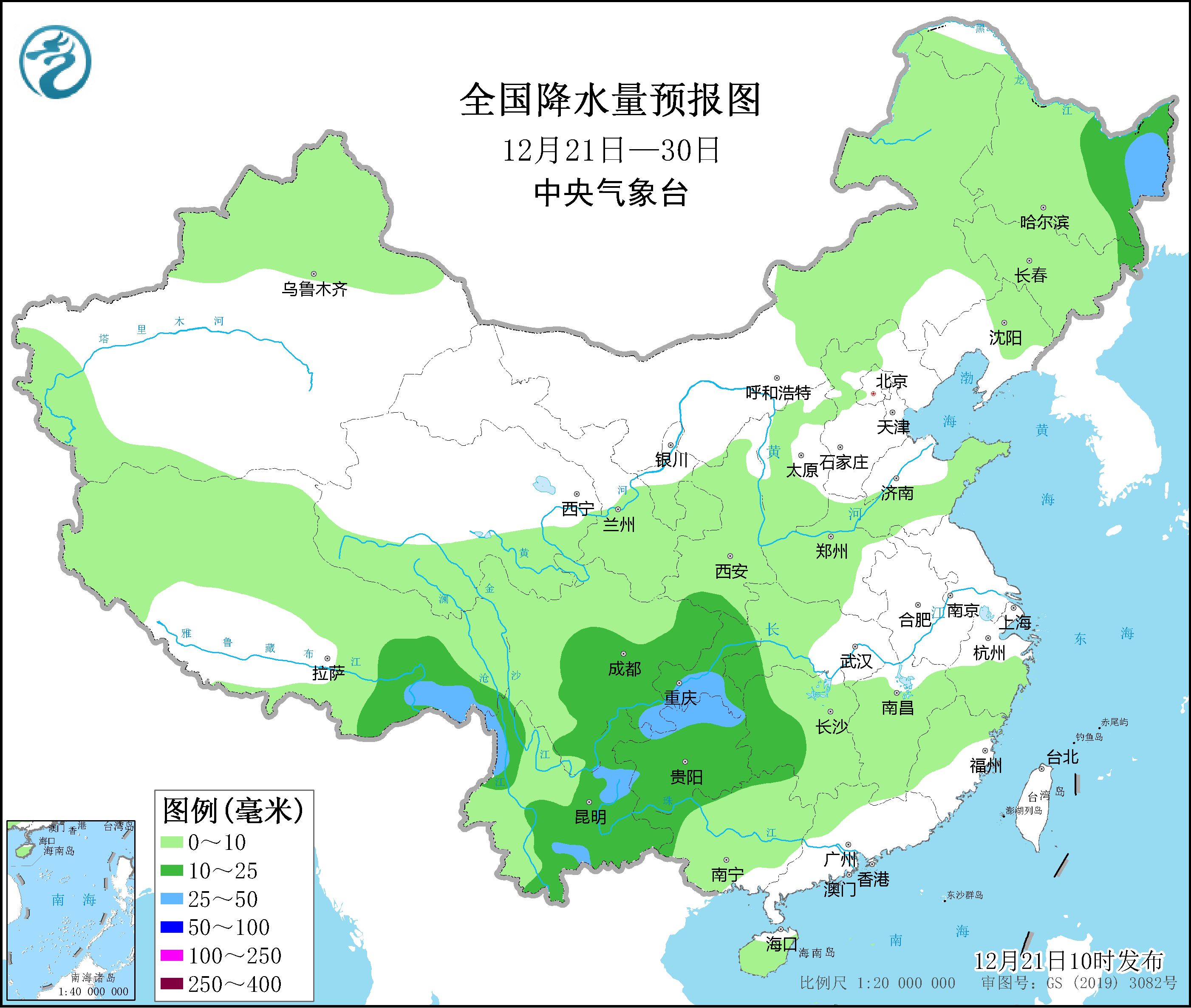 未來10天(12月21-30日),東北地區中北部、西南地區東部及西藏東部、河南西部、湖北西部、山東半島等地有3~10毫米降水,其中西南地區東部及黑龍江東部部分地區有15~30毫米;上述地區降水量較常年同期偏多2~5成,黑龍江東部偏多1~3倍;我國其餘大部地區降水偏少。
