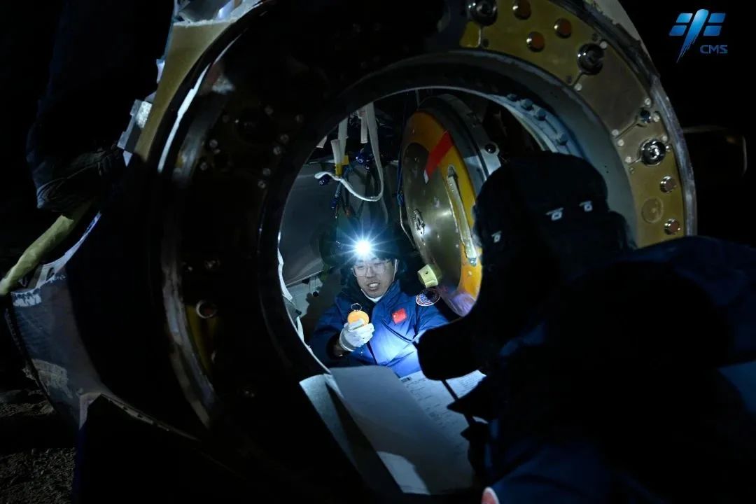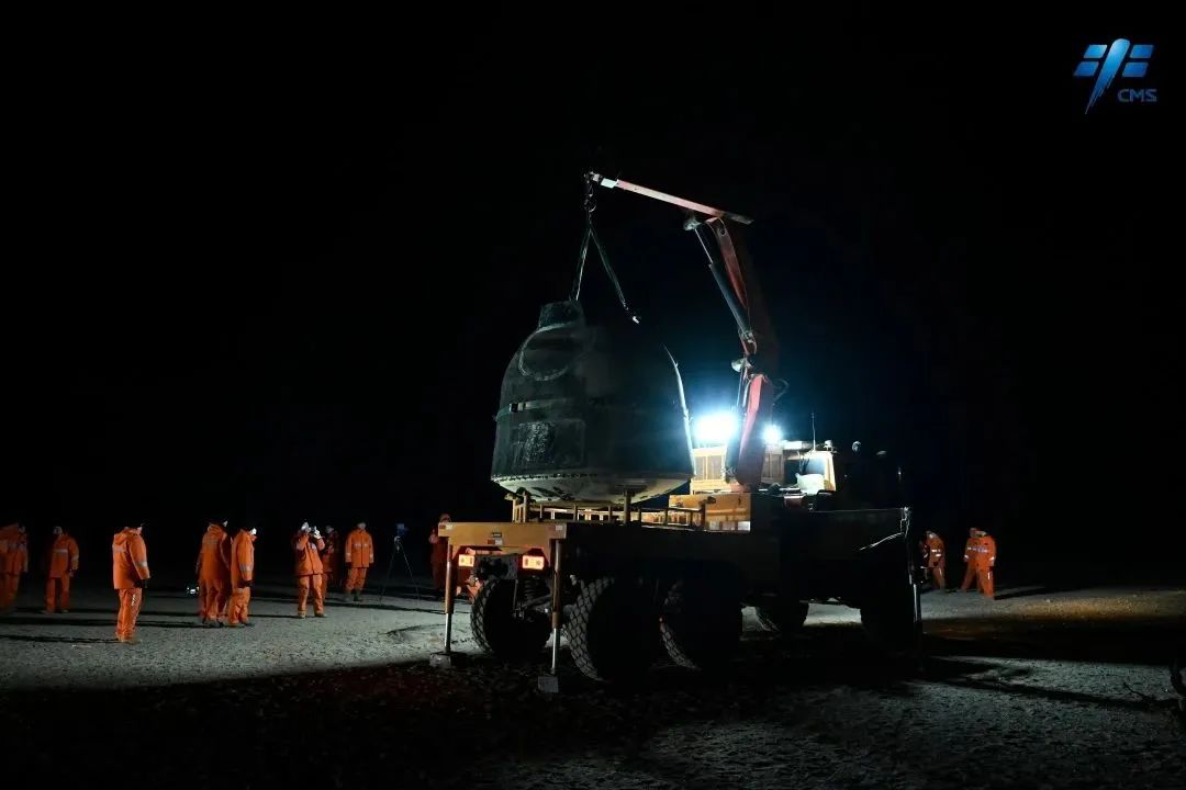 地面人員正在對神舟十四號載人飛船返回艙進行回收
