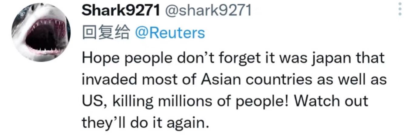 網友@Shark9271表示,希望人們不要忘記是日本入侵了亞洲國家,並殺害了很多人!小心他們會再次這樣做。
