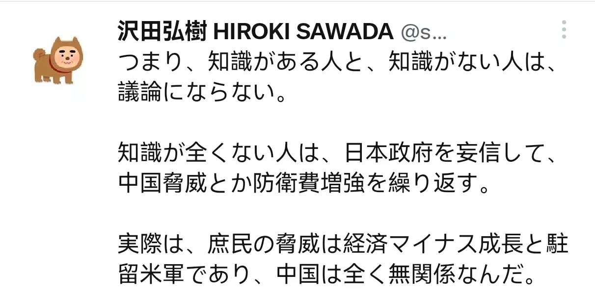 網友@HIROKI表示,總之,有知識的人是不會和沒有知識的人爭論的。完全沒有知識的人才會盲目信任日本政府反覆渲染的中國威脅。事實上,真正對老百姓構成威脅的是經濟負增長和駐日美軍,與中國完全沒有關係。