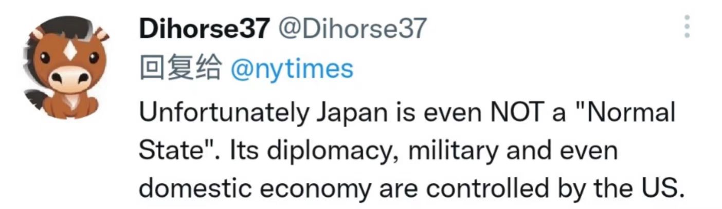 網友@Dihorse37表示,不幸的是,日本甚至不是一個“正常國家”。它的外交、軍事甚至國內經濟都由美國控制。