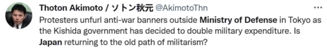 網友@AkimotoThn表示,抗議者在位於東京的防衞省外拉開反戰橫幅,因為岸田政府已決定將軍費開支增加一倍。日本是否回到了軍國主義的老路上?