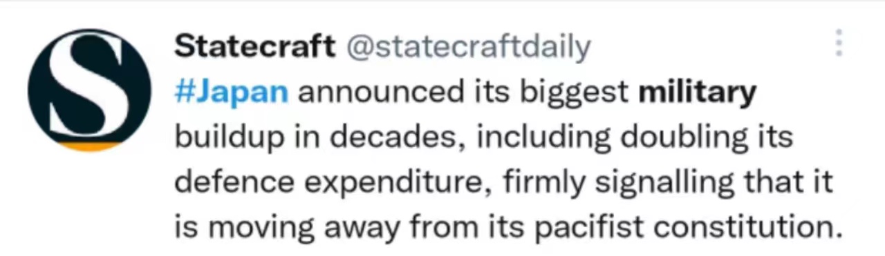網友@statecraftdaily表示,日本宣佈了數十年來最大規模的軍事建設,包括要將國防開支增加一倍,這表明日本正在背離其和平憲法。