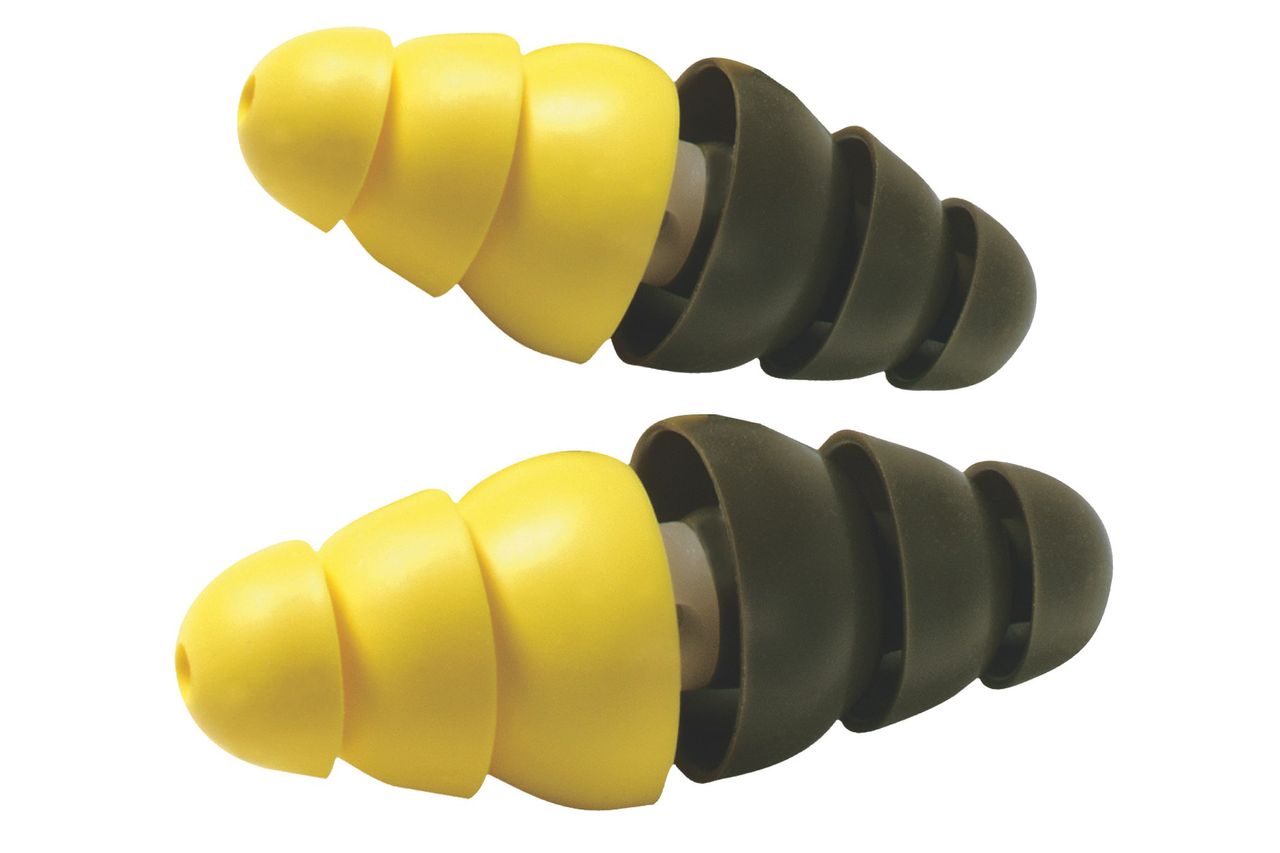 這種黃綠色耳塞設計為朝一個方向插入時可阻擋噪音。朝另一個方向插入時,則設計為允許聽到附近的聲音,但仍能保護耳朵免受有害噪音的傷害。