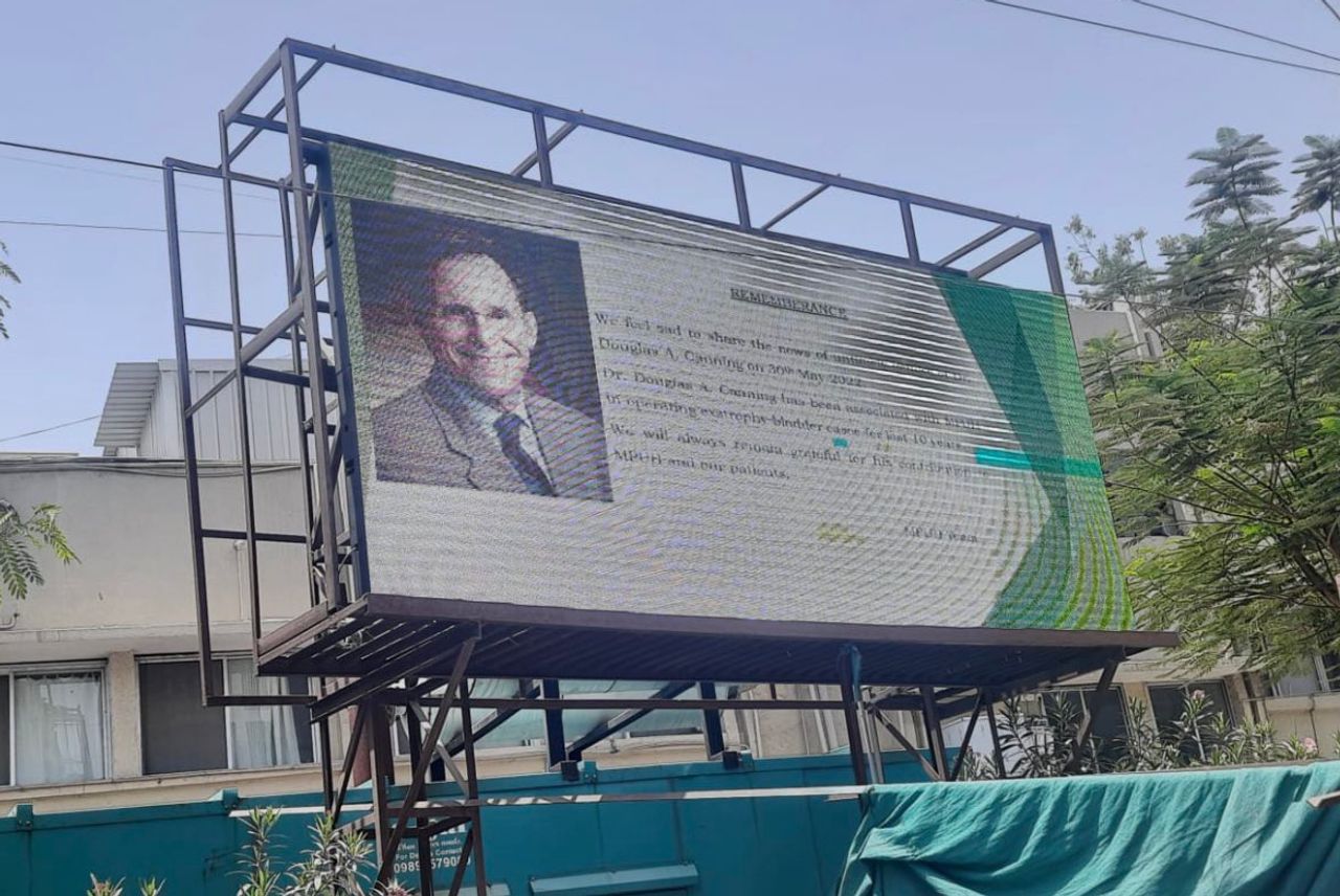 印度納迪亞德Muljibhai Patel泌尿外科醫院外,道格拉斯·坎寧醫生的廣告牌,他作為客座教授在此進行復雜手術。圖片來源:阿西姆·舒克拉刊載於2022年6月14日印刷版,標題為《道格拉斯·A·坎寧》。