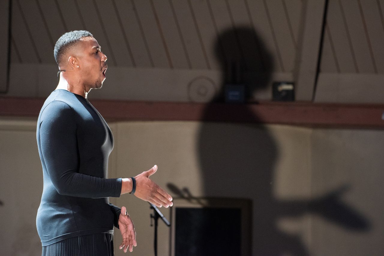 達沃內·泰恩斯攝影:蒂莫西·蒂格當晚泰恩斯先生同樣展現了非凡才華——由於原定音樂節重頭戲、與著名女高音朱莉婭·布洛克合作的奧利維埃·梅西安高難度聲樂套曲《哈拉維》舞台版因她感染新冠遺憾取消,他臨時替換上了自己設計的曲目。我們因此欣賞到《獨唱會第一號:彌撒》的加長版,這套收錄巴赫、卡羅琳·肖、瑪格麗特·邦茲、摩西·霍根等人短篇作品的合集通常僅由鋼琴與人聲演繹,但當晚增加了大提琴、打擊樂和第二架鋼琴。説泰恩斯先生掌控了舞台,遠不足以形容他的震撼力。