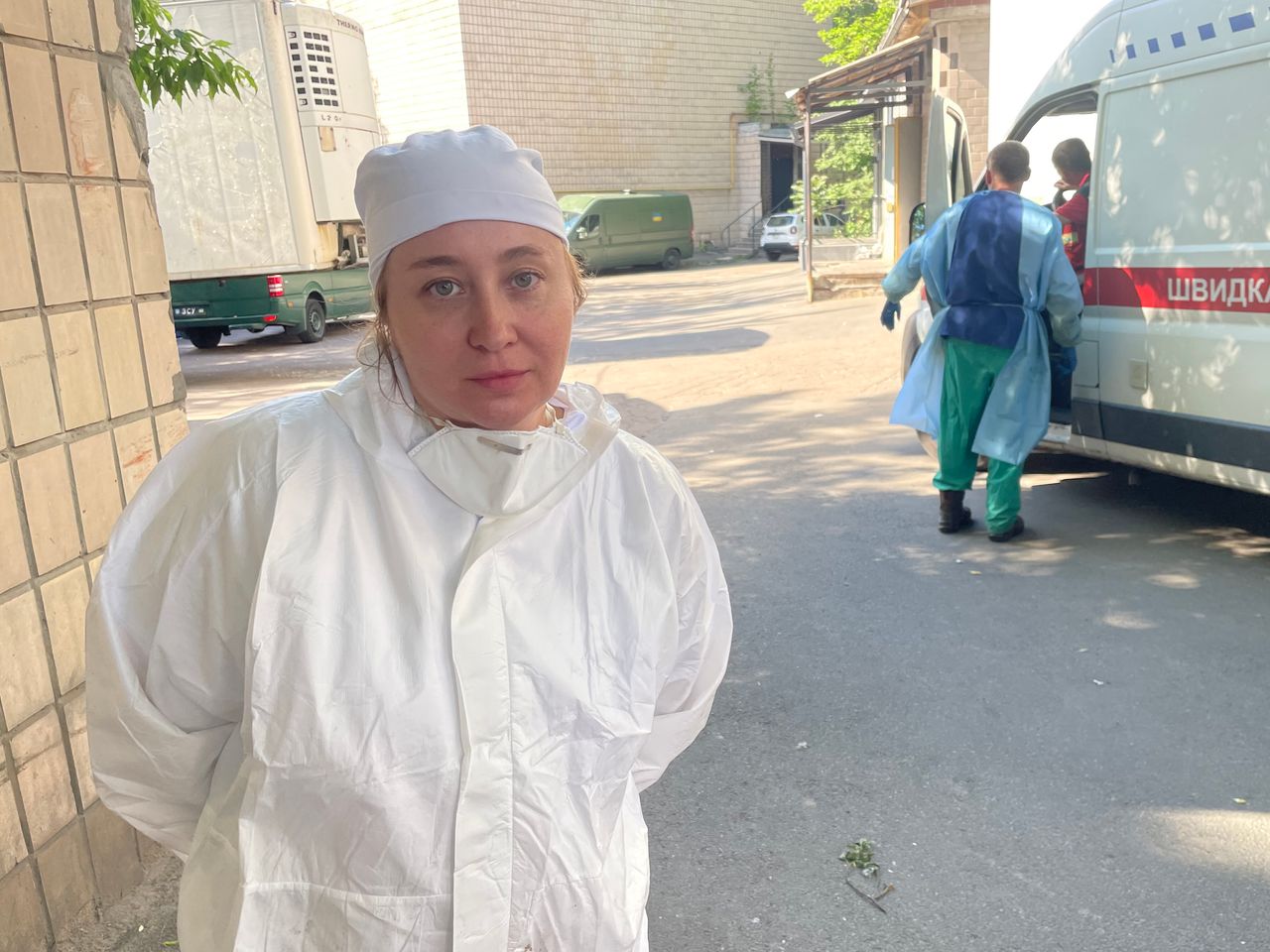 奧萊娜·托爾卡喬娃負責照料陣亡士兵及其家屬。她站在基輔停屍房外,那裏已接收了約50具來自馬裏烏波爾的遺體。攝影:吉莉安·凱·梅爾基奧爾刊載於2022年6月14日印刷版《烏克蘭戰俘在哪裏?》。