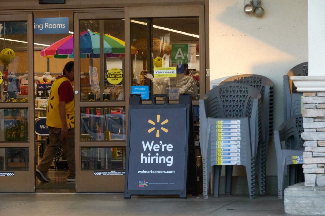 5月15日,加州託倫斯市一家沃爾瑪門店外立着"正在招聘"的標牌。圖片來源:Bing Guan/Bloomberg News刊發於2022年6月15日印刷版,標題為《緩解勞動力短缺需從邊境政策着手》。