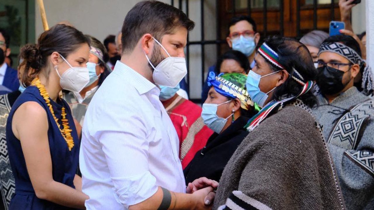 三月,加夫列爾·博裏奇總統在聖地亞哥總統府會見馬普切領袖,此前他在競選期間承諾援助該族羣。圖片來源:智利總統府/法新社/蓋蒂圖片社作為候選人時,博裏奇曾表達過對反對資本主義及採掘業(包括伐木)的馬普切活動家的理念認同。但上任三個月後,這位總統正承受着恢復拉丁美洲最發達經濟體秩序的壓力。