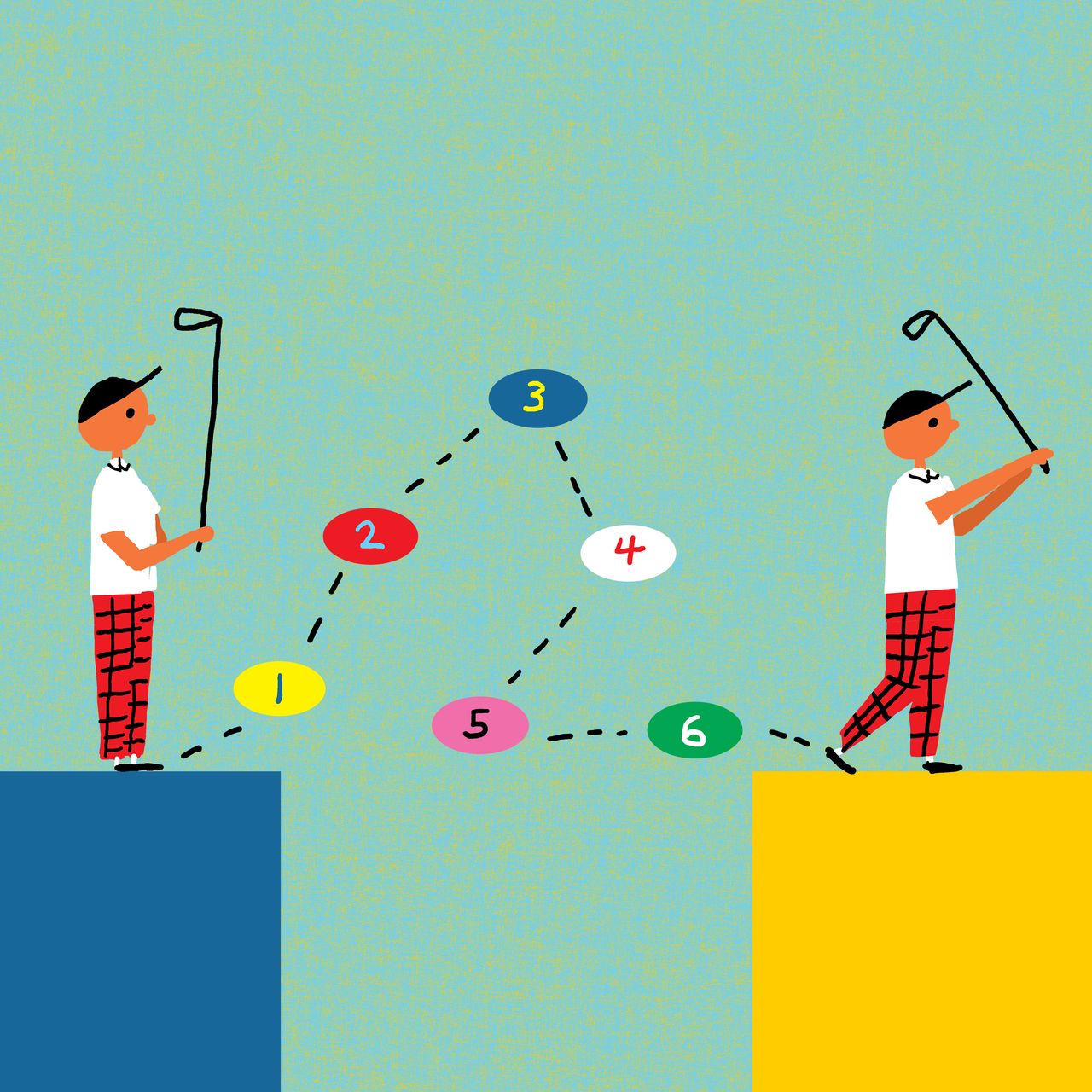 一套有效的高爾夫擊球前例行程序能讓你從思緒遊離狀態轉為專注,經過計劃、想象直至完成擊球。插圖:James Yang作為人類,我們生命中相當多時間都處於與任務無關的思維狀態——俗稱走神。事實上,根據[研究](https://wjh-www.harvard.edu/~dtg/KILLINGSWORTH & GILBERT (2010).pdf),我們近半清醒時間都在神遊,糾結於關於過去、現在和未來的各種念頭。