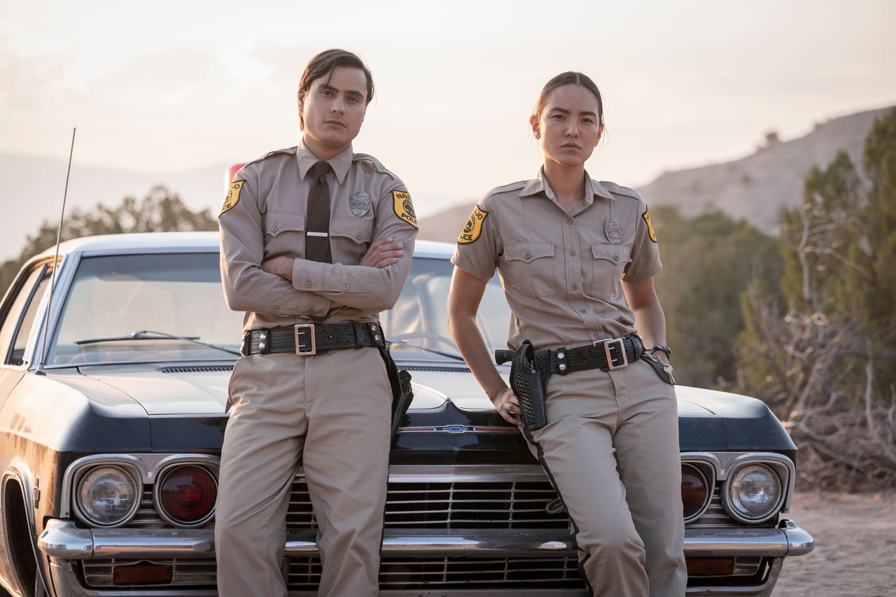 基奧瓦·戈登(左)和傑西卡·馬滕(右)在年代劇《暗風》中飾演納瓦霍部落警察局的警官。圖片來源:邁克爾·莫里亞蒂斯/Stalwart Productions/AMC《暗風》加入了由原住民製片人、導演和明星主導的、以原住民社區為背景的電視劇行列,這類劇集正日益增多。其中包括兩部今年夏天將進入第二季的喜劇:《拉瑟福德瀑布》(Peacock平台)和《保留地之犬》(Hulu平台的FX頻道),後者也由麥克拉農飾演一名保留地警察。