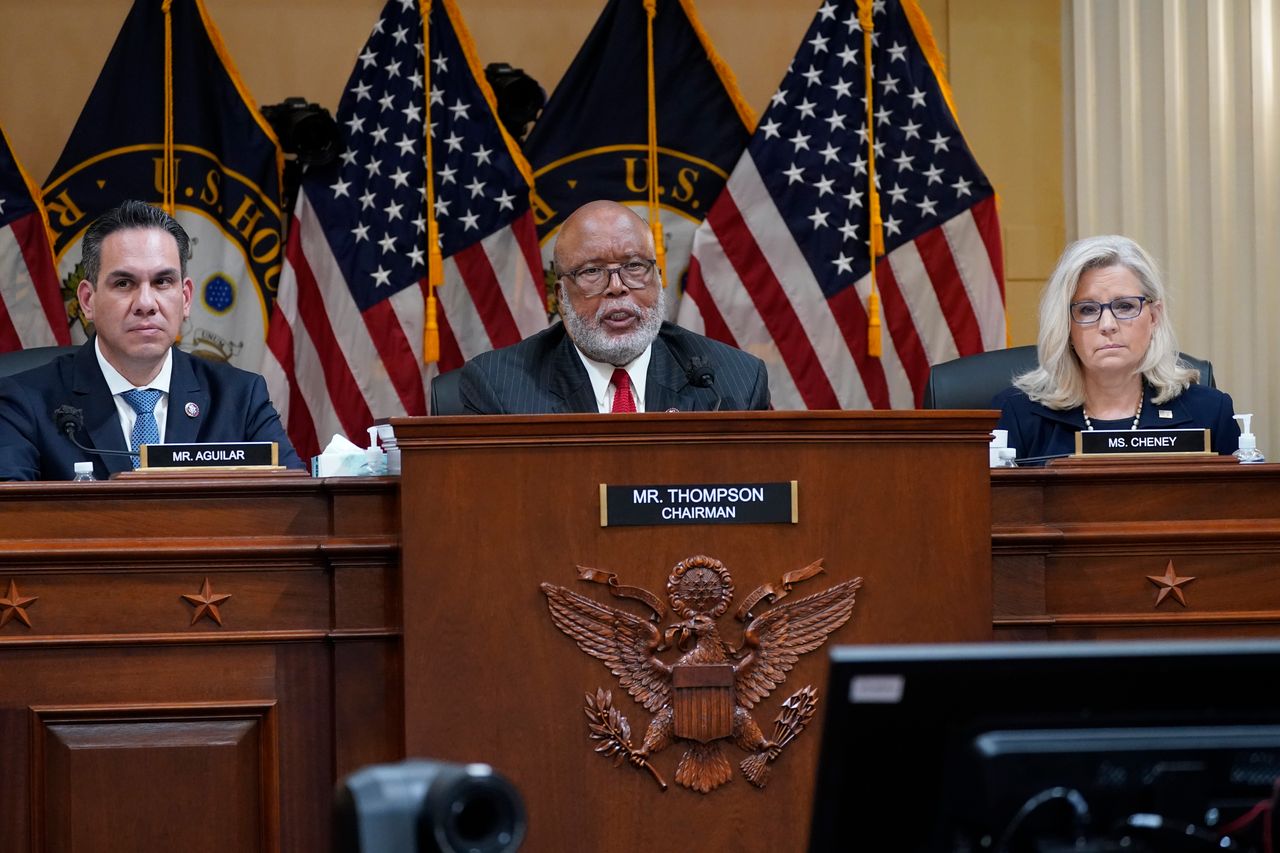 眾議員本尼·湯普森(中)與1月6日委員會其他成員在週四的聽證會上。圖片來源:J·斯科特·阿普爾懷特/美聯社委員會重播了特朗普呼籲彭斯阻止選舉人團計票的視頻和推文,其中引用了多個州存在選舉欺詐的虛假指控。特朗普否認與騷亂有關的任何不當行為,並稱委員會的調查是一場騙局。