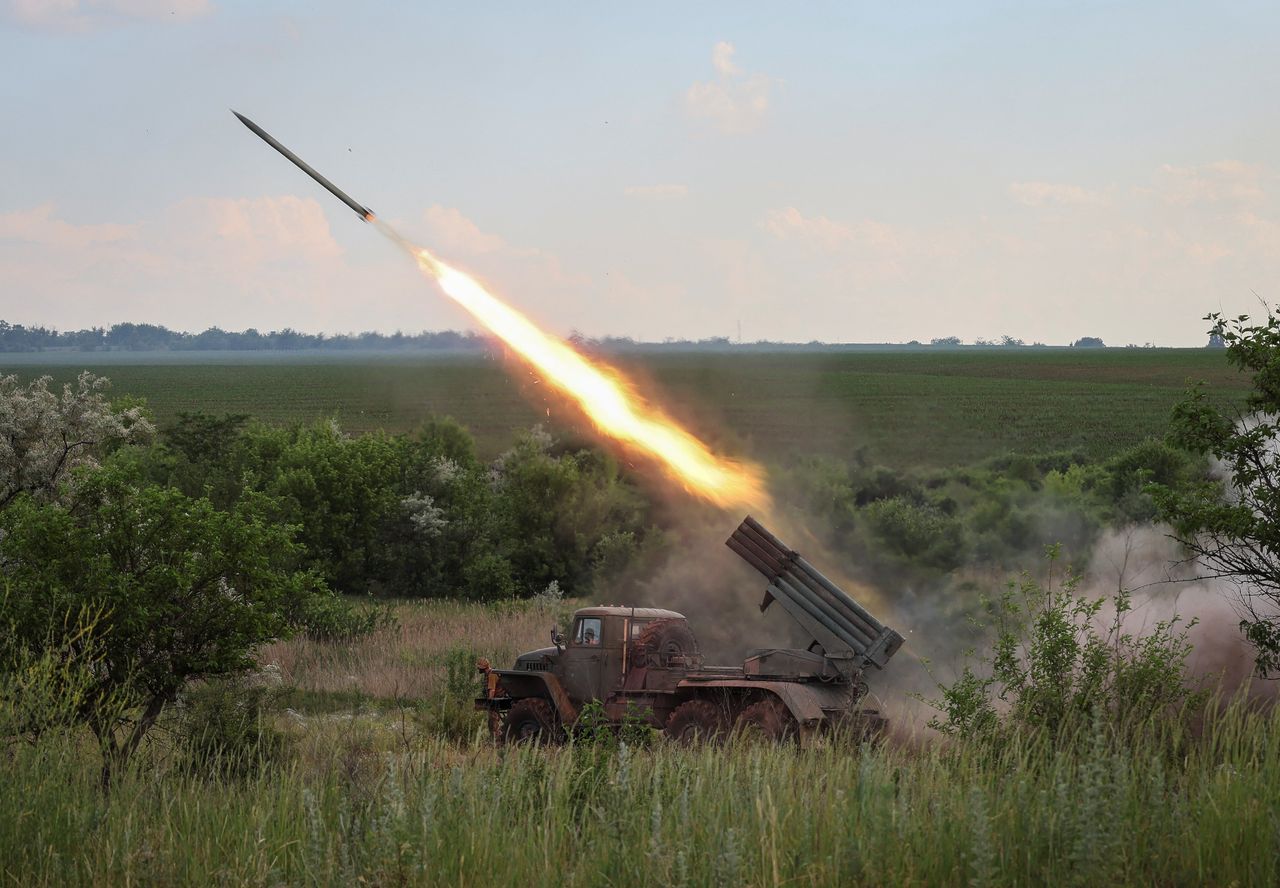 6月12日,烏克蘭軍人在頓涅茨克地區巴赫穆特鎮附近發射BM-21"冰雹"多管火箭炮系統。圖片來源:GLEB GARANICH/REUTERS