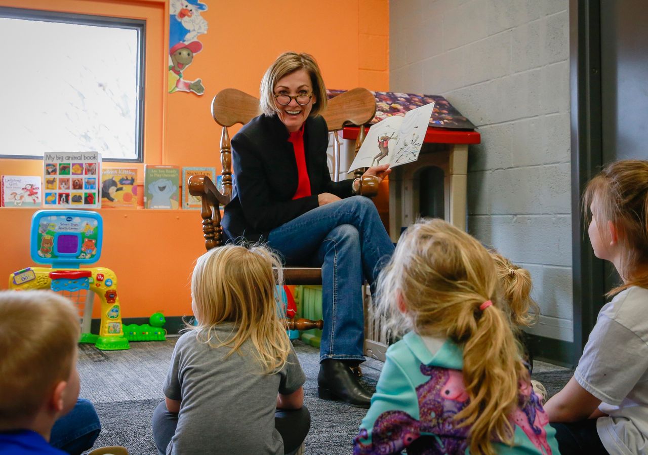 3月18日,愛荷華州州長金·雷諾茲在愛荷華州馬尼拉的Little Hawks兒童保育中心為孩子們讀書。圖片來源:Bryon Houlgrave/美聯社刊發於2022年6月18日印刷版,標題為《愛荷華州的教育選擇變革》。